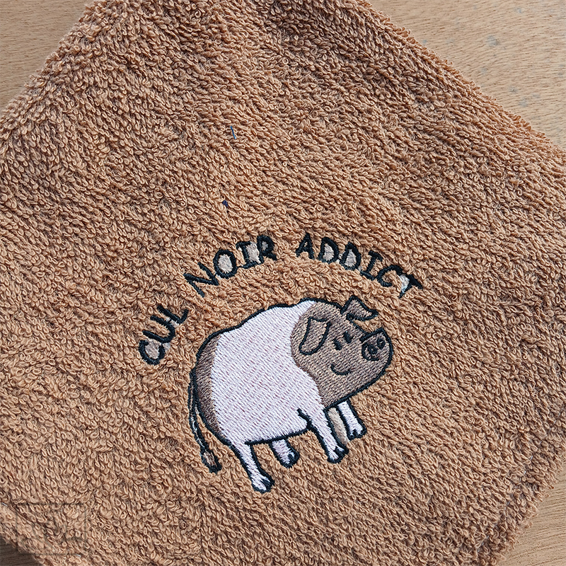 En éponge de coton avec un dessin original de l’illustratrice limousine Flobert brodé :
