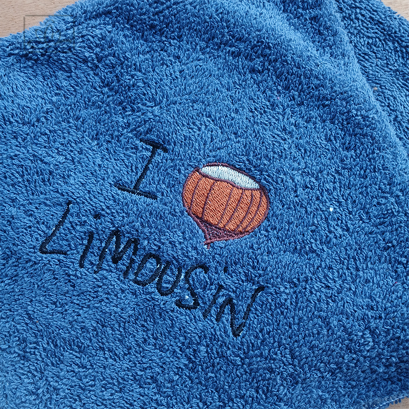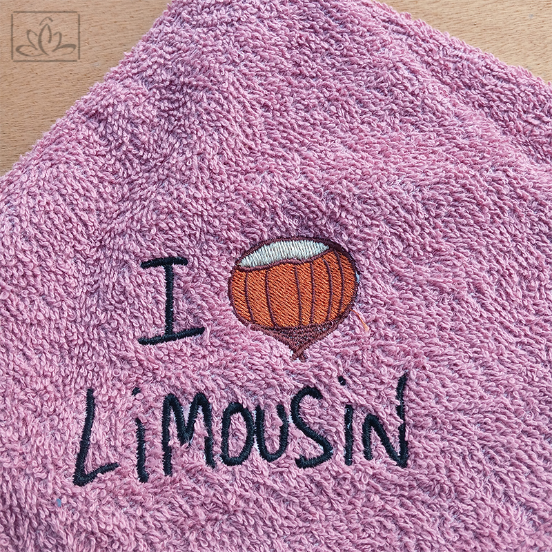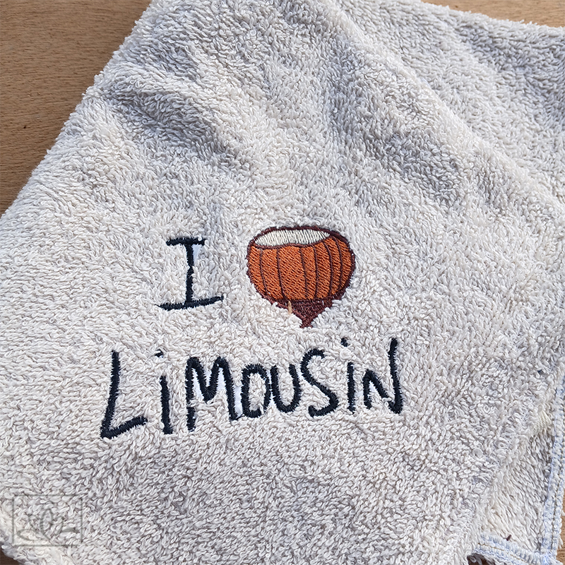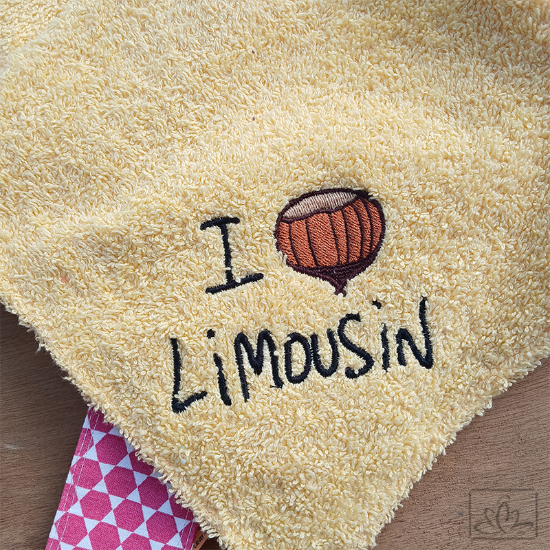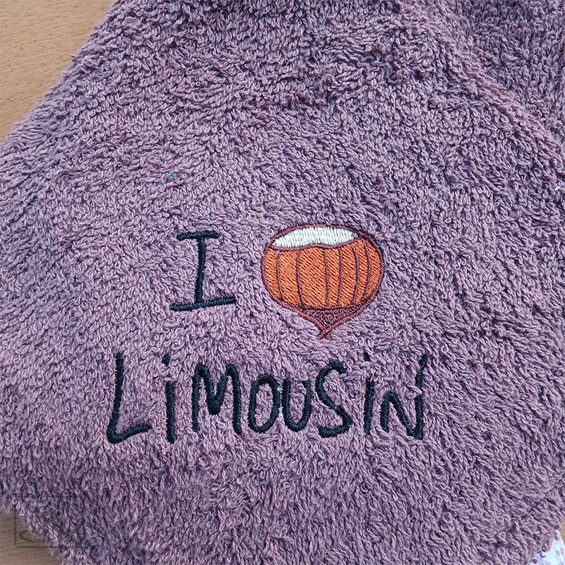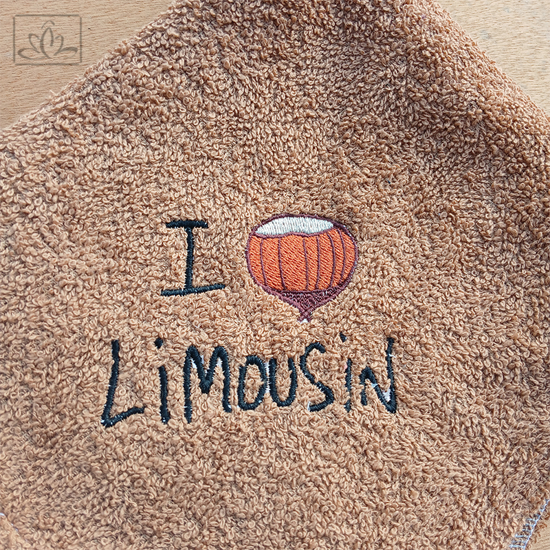 En éponge de coton avec un dessin original de l’illustratrice limousine Flobert brodé :