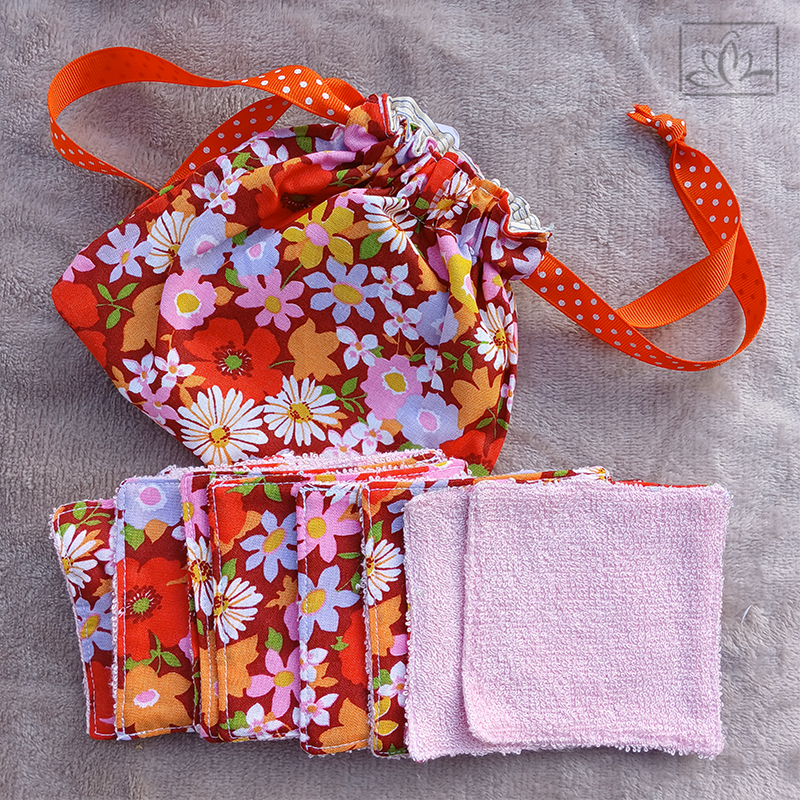 Set de 10 lingettes lavables en coton d’un coté, tissu éponge de bambou (qui reste doux après lavage) sur l’autre face avec la petite pochette (ou le petit filet) assortie pour les ranger.